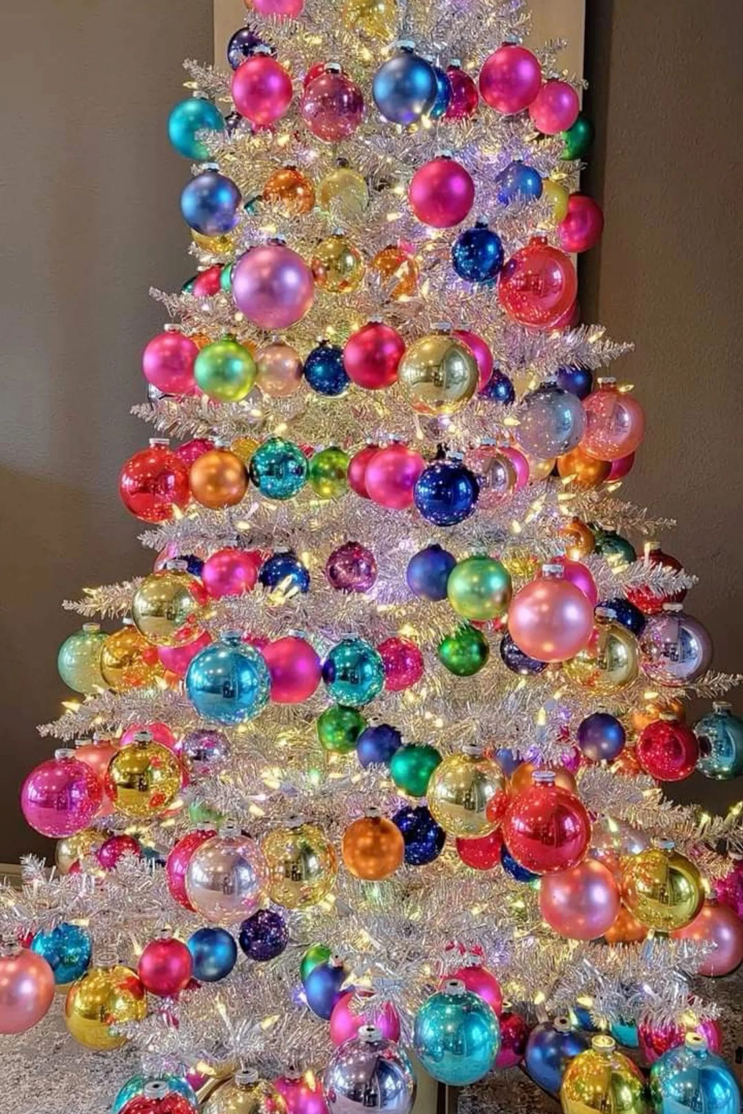 Choose a silver tinsel tree with a full silhouette so ornaments have ample coverage. Use warm white lights only, as cool lights can feel harsh against metallic finishes. Select ornaments in a wide range of jewel tones but keep finishes glossy or metallic for cohesion. Hang ornaments close together to create a layered effect that feels lush rather than sparse. Avoid garland so the ornaments remain the star. Place the tree against a neutral wall to let the colors shine without visual competition. This look pairs well with modern furniture and bold accent pieces.
