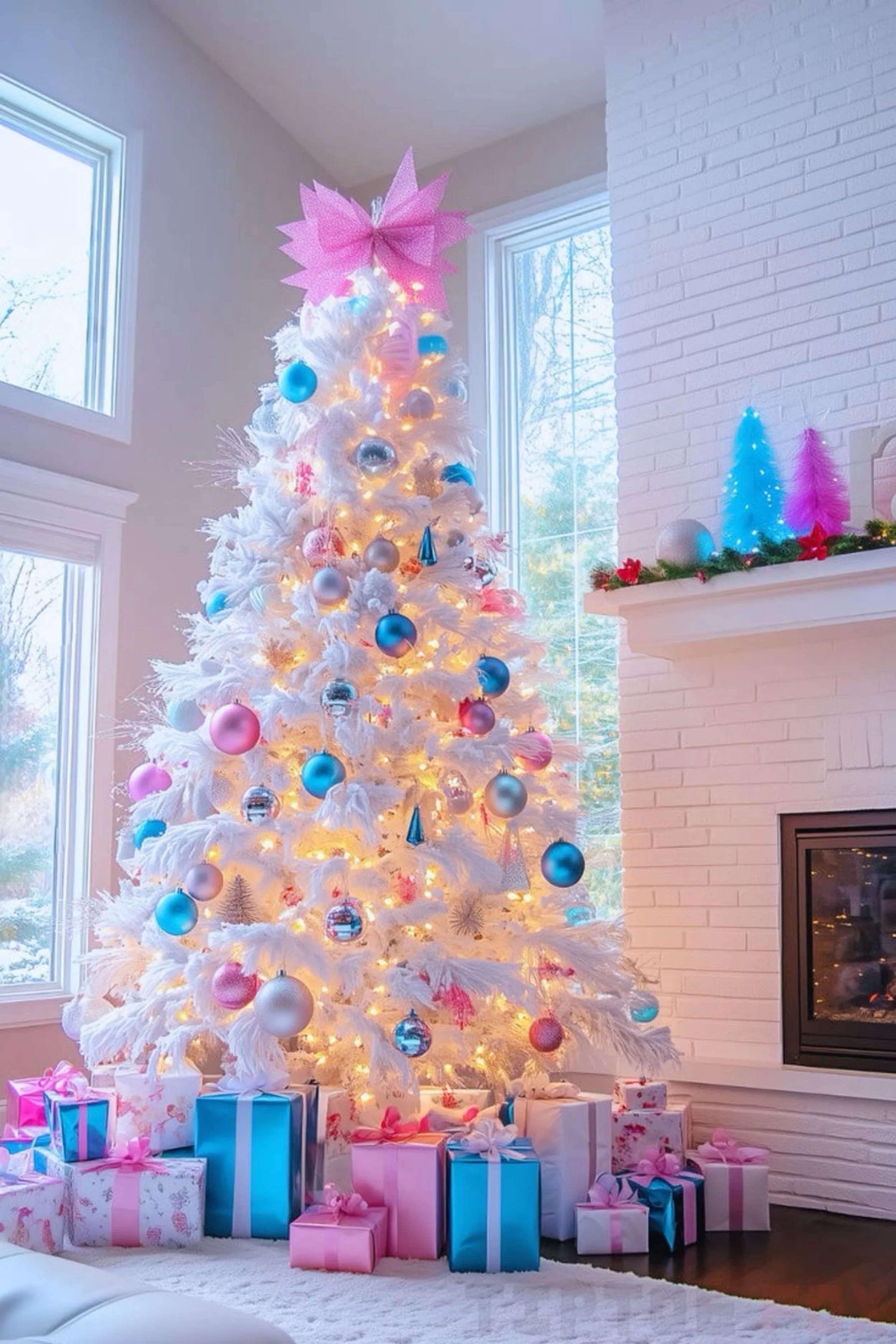 This white Christmas tree delivers high fashion holiday elegance through blush pink and aqua ornaments paired with an oversized bow topper. Warm lights glow beneath feathery branches, creating depth and softness throughout the design. Metallic finishes add subtle glamour while the balanced color palette keeps the look refined rather than flashy. Wrapped gifts below repeat the pastel tones, reinforcing the curated aesthetic. This tree feels polished, feminine, and perfect for upscale living rooms with tall windows and abundant natural light.