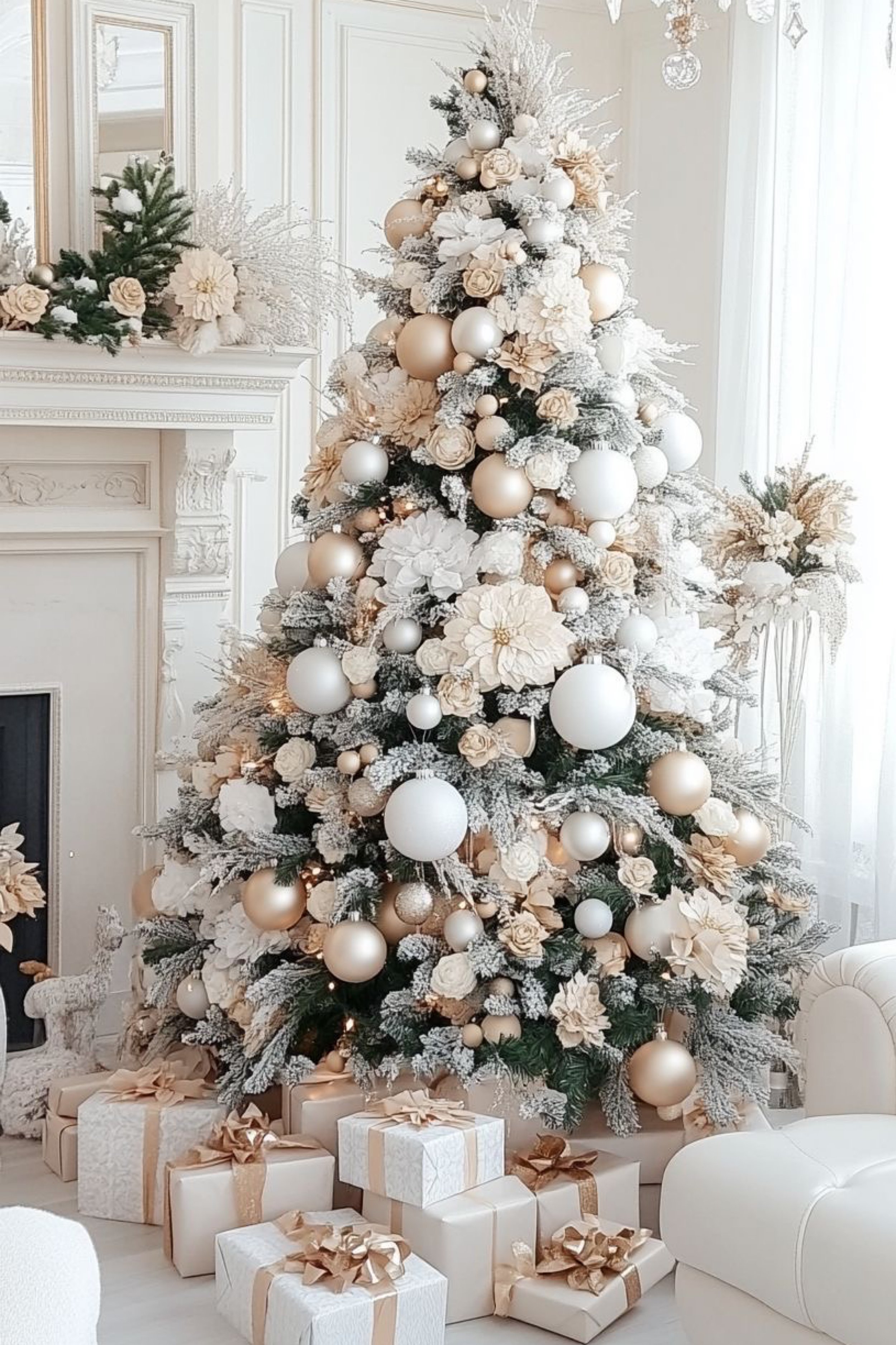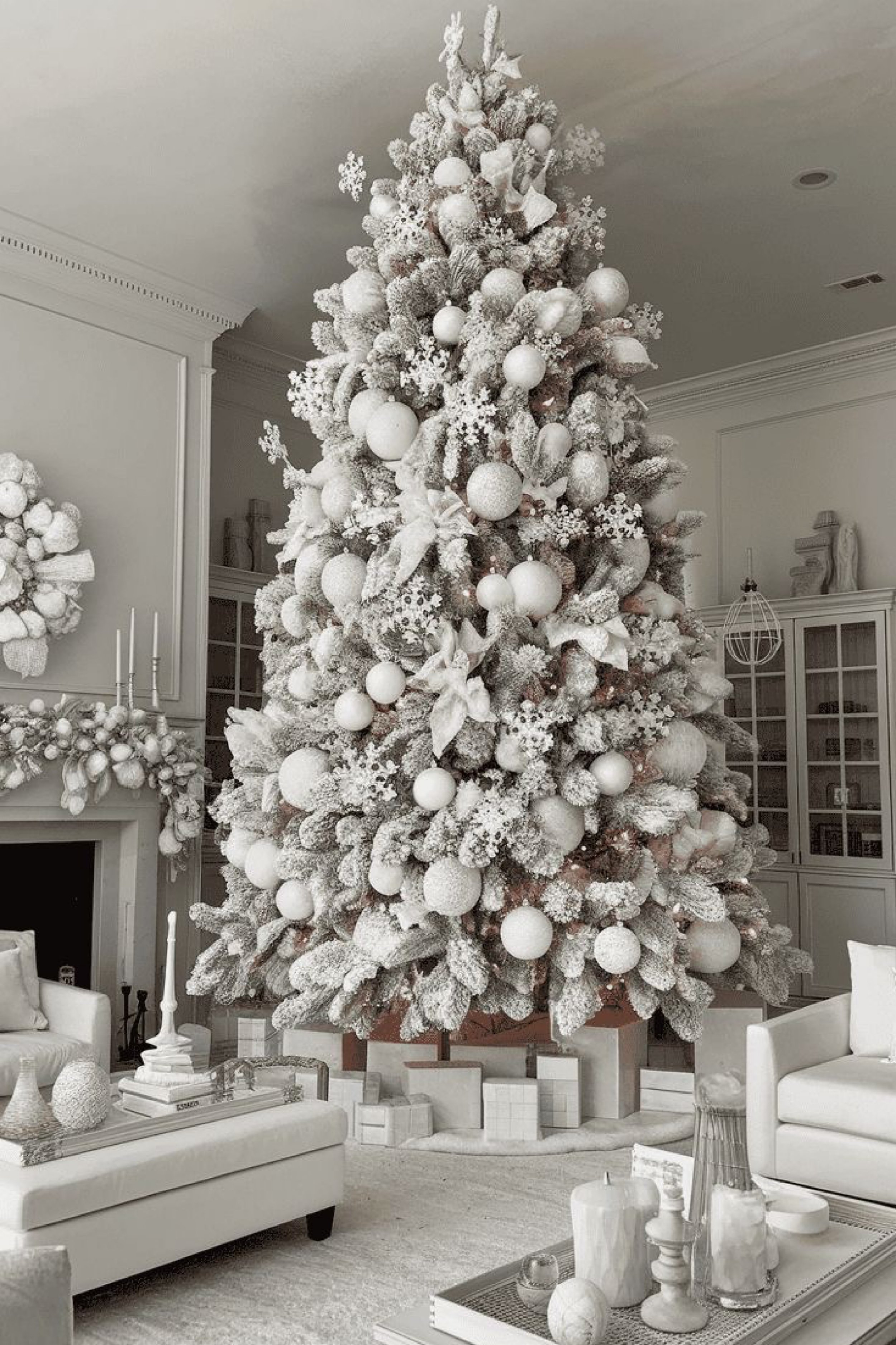 This towering flocked Christmas tree feels like the centerpiece of a stately winter estate. Warm golden lights glow softly beneath heavy snow covered branches, creating depth and warmth despite the monochrome palette. Subtle metallic ornaments blend seamlessly into the tree, allowing the flocking and scale to take center stage. Surrounded by neutral wrapped gifts and plush rugs, this design feels timeless, elegant, and quietly luxurious. It is perfect for homes with high ceilings and expansive windows.