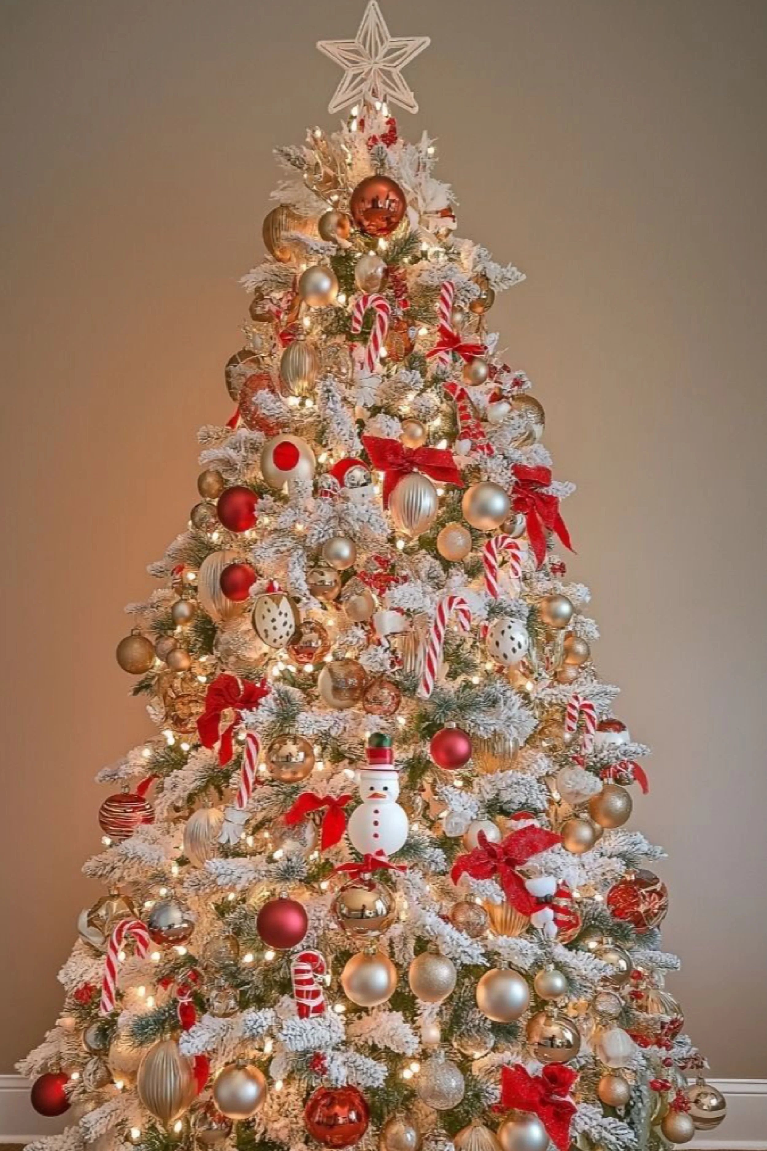 This richly decorated Christmas tree blends traditional holiday warmth with a polished gold and red palette. Frosted branches cradle metallic ornaments, candy canes, and velvet bows, creating layers of texture and nostalgic charm. Warm lights glow throughout, giving the tree a soft radiance that feels inviting and timeless. The ornament density adds fullness without chaos, making the tree feel abundant and celebratory. This design is perfect for classic living rooms, formal spaces, or homes that embrace traditional Christmas décor with elevated detail.