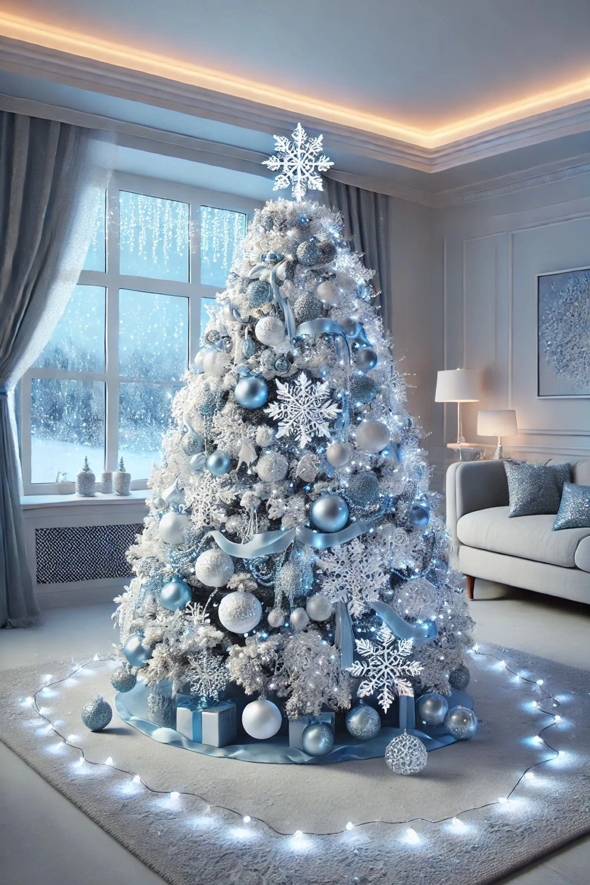 Choose a full white flocked tree with strong branch support for heavier ornaments. Use cool white or icy blue lights to enhance the frozen aesthetic. Layer large snowflake ornaments first, placing them evenly throughout the tree for balance. Add medium and small blue and silver ornaments to fill gaps and create depth. Incorporate satin ribbon in soft icy tones, draping it loosely for movement. Finish with a dramatic snowflake topper and coordinated gift wrap to ground the look.