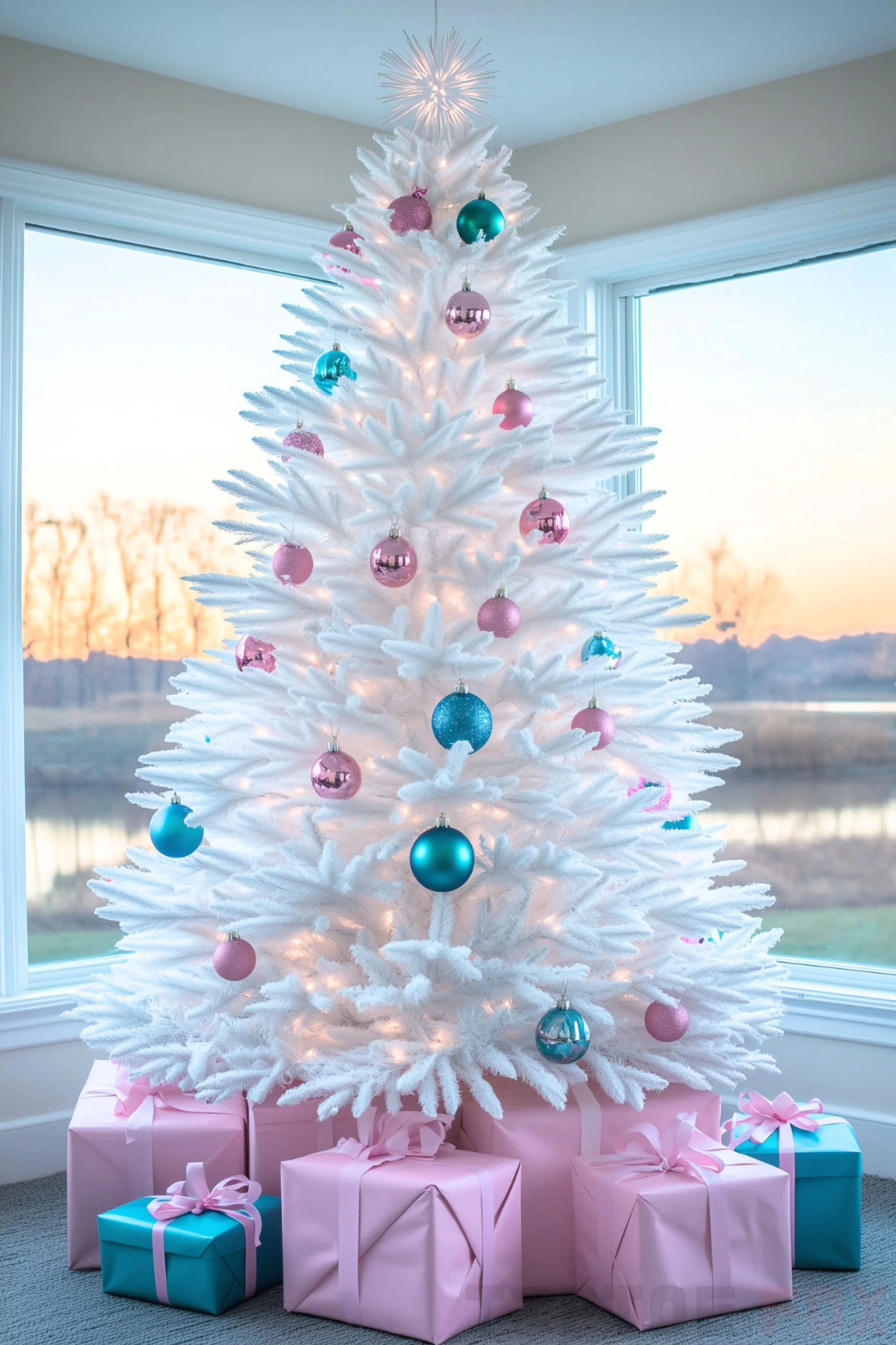 This softly styled white Christmas tree captures a dreamy pastel palette that feels calm, modern, and quietly magical. Pale pink and aqua ornaments are spaced gently across snowy branches, allowing the tree to breathe visually. A radiant starburst topper adds a subtle sculptural element without overpowering the softness of the design. Wrapped gifts below in blush and teal tones echo the ornament colors, creating a harmonious base that feels intentional and serene. The natural landscape outside the windows enhances the tranquil mood, making this tree ideal for minimalist homes or spaces designed around light and openness. The overall look is peaceful and refined, offering a contemporary take on holiday décor that prioritizes balance and restraint.