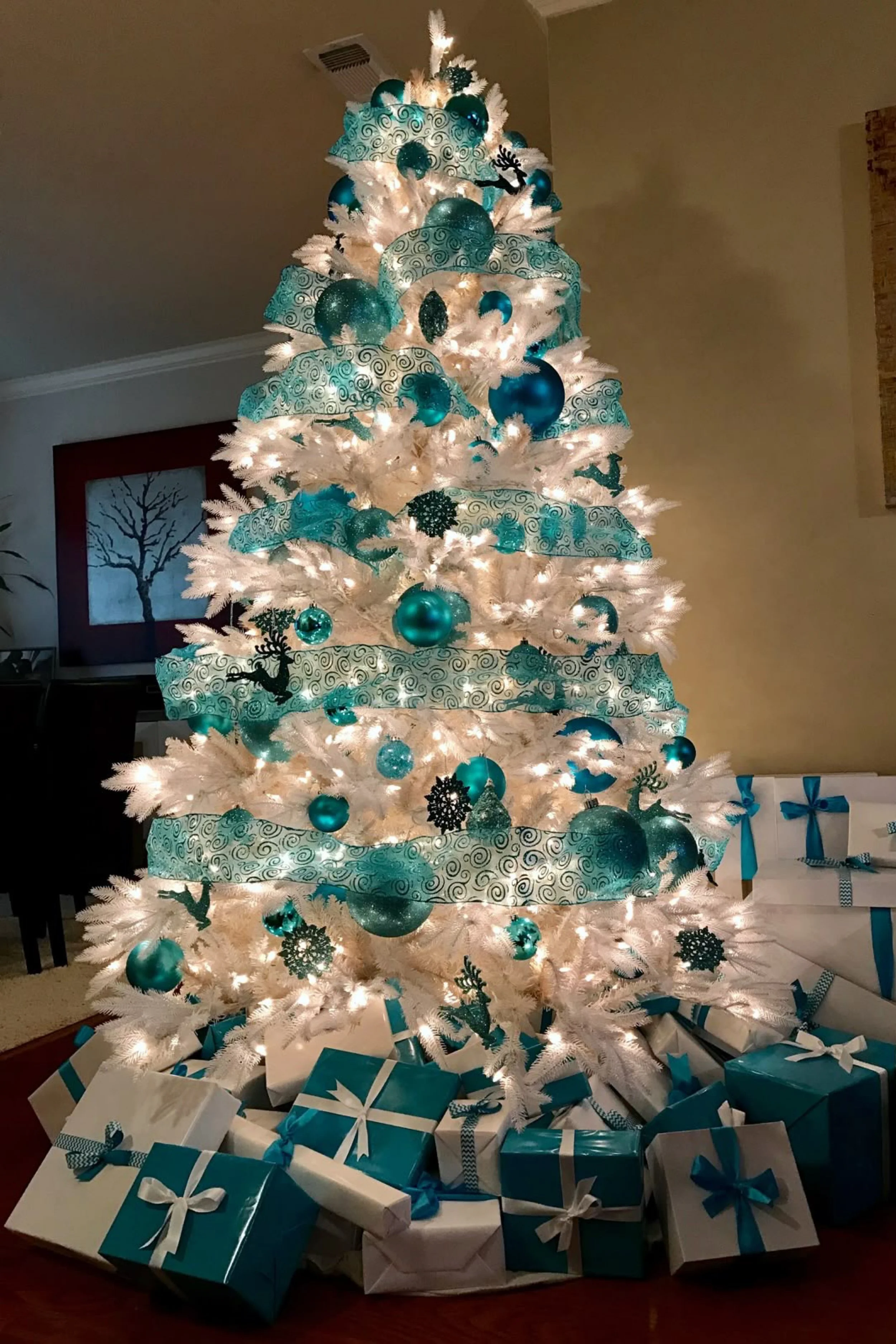 This white Christmas tree is wrapped in layers of teal ribbon that create a cascading, elegant silhouette from top to base. Glossy teal ornaments shimmer among snowy branches while warm lights add depth and softness. The ribbon garland introduces movement and texture, giving the tree a sculptural quality that feels dramatic yet controlled. Coordinated teal and white gifts below ground the design, making the entire display feel luxurious and intentional. This tree works beautifully in evening lit spaces where glow and contrast take center stage.