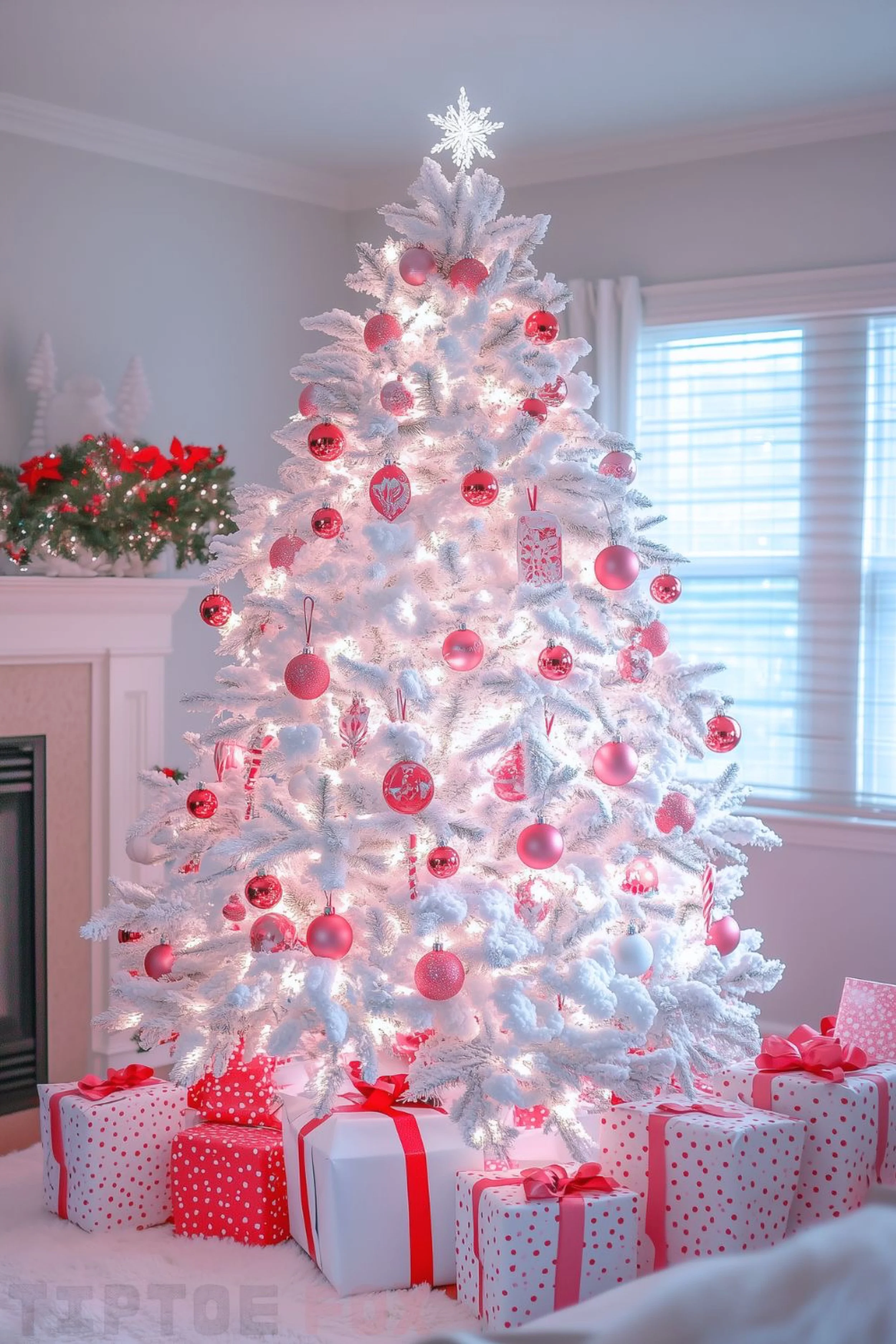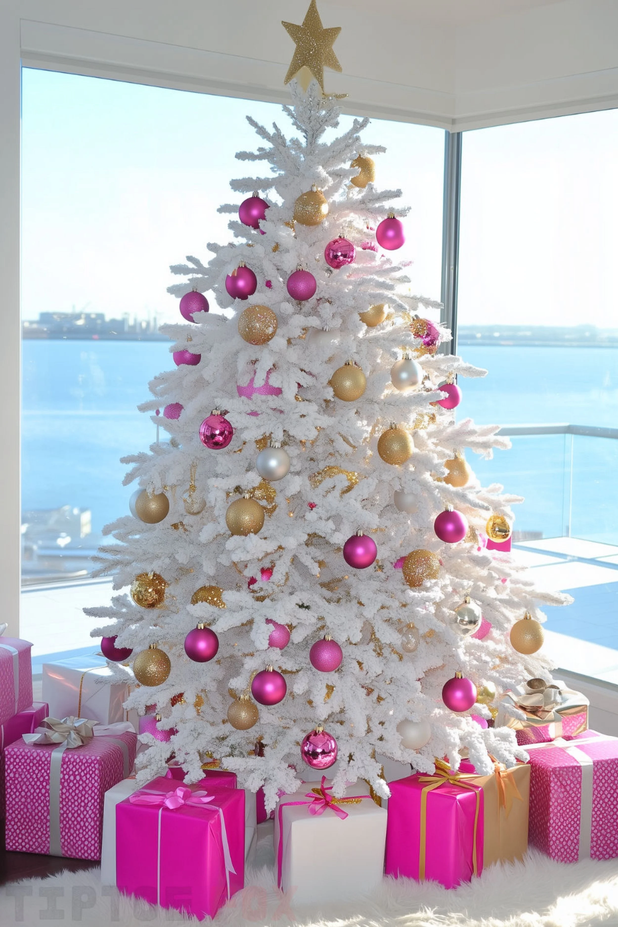 This white flocked Christmas tree blends glamorous color with a serene coastal backdrop, creating a look that feels both celebratory and elevated. Hot pink, soft gold, and pearly white ornaments shimmer against snow white branches, catching daylight and reflecting it softly throughout the room. The gold star topper adds a classic finishing touch while maintaining a polished modern edge. Wrapped gifts in vivid pinks and creamy neutrals anchor the design, turning the base of the tree into a focal point rather than an afterthought. The overall effect feels luxurious without heaviness, making this tree ideal for high rise interiors, waterfront homes, or spaces filled with natural light. The bold pink ornaments add personality and confidence, while the white flocking keeps the palette clean and airy. This design strikes a beautiful balance between playful femininity and refined holiday elegance, offering a fresh alternative to traditional red and green.