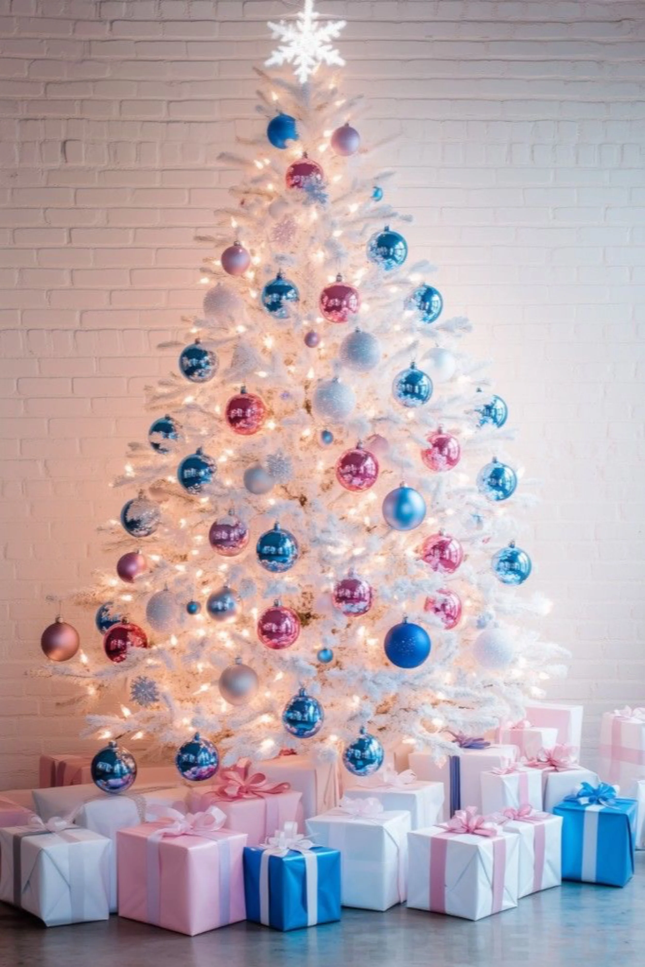 This white Christmas tree pairs icy blue ornaments with soft blush accents for a look that feels airy, romantic, and quietly festive. The flocked branches glow under warm white lights, creating a soft halo that enhances the pastel palette rather than overpowering it. Blue ornaments add crisp contrast while pink tones bring warmth and balance. Wrapped gifts below mirror the same colors, reinforcing a curated and intentional presentation. Set against a white brick backdrop, this tree feels modern yet cozy, making it perfect for minimalist interiors that still crave seasonal charm.