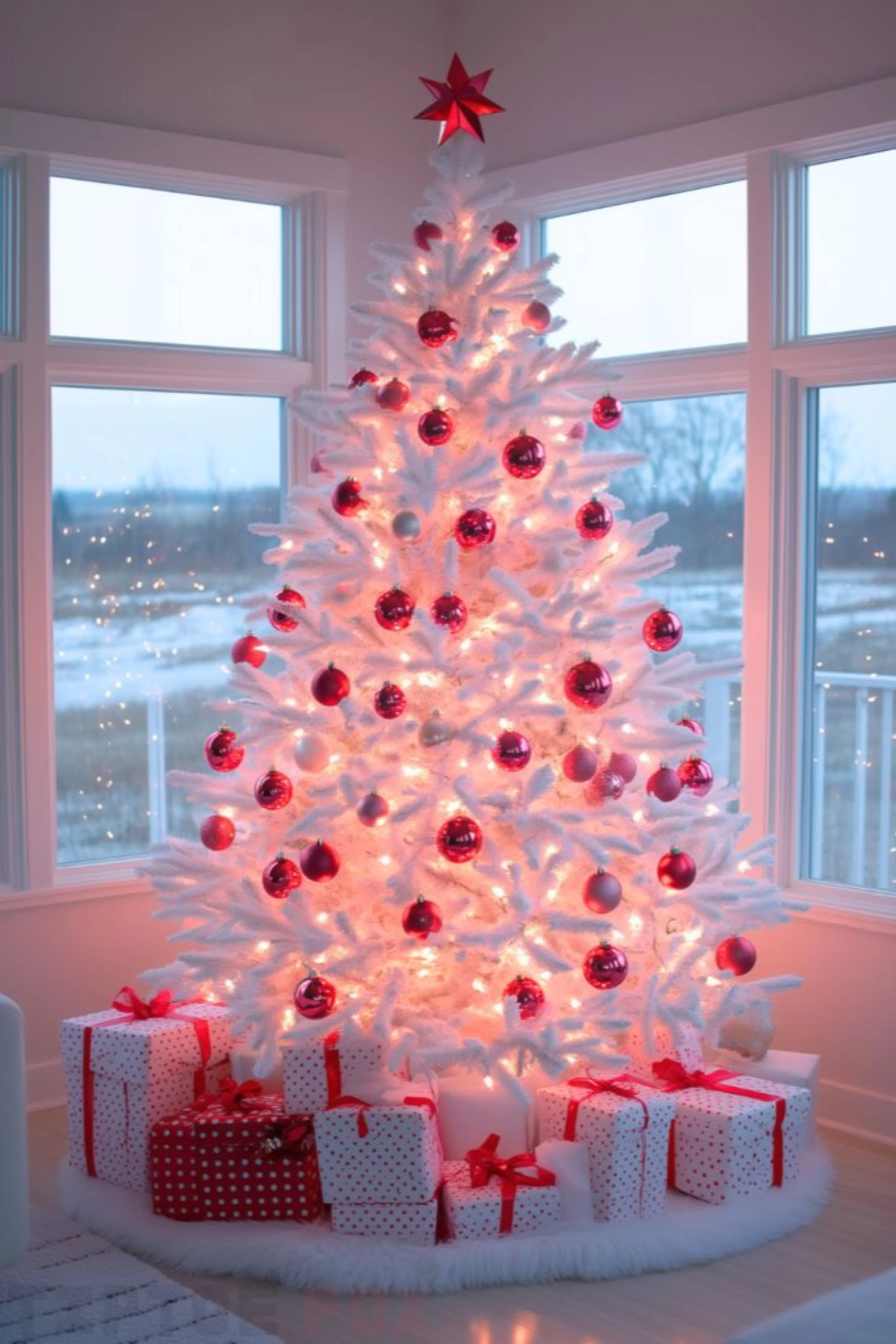 This white Christmas tree radiates warmth through a bold red ornament palette that feels timeless yet refreshed. Glossy crimson ornaments glow softly as warm white lights illuminate the flocked branches, creating a cozy winter atmosphere even in bright daytime spaces. The red star topper crowns the tree with confidence, while neatly wrapped gifts below mirror the same classic red and white color story. Snowy views outside the windows amplify the contrast, making the tree feel like the heart of the room. This design embraces traditional holiday colors but feels modern due to its clean execution and restrained ornament placement. The simplicity of the palette allows the glow of the lights to take center stage, creating an inviting ambiance that feels festive without visual clutter.