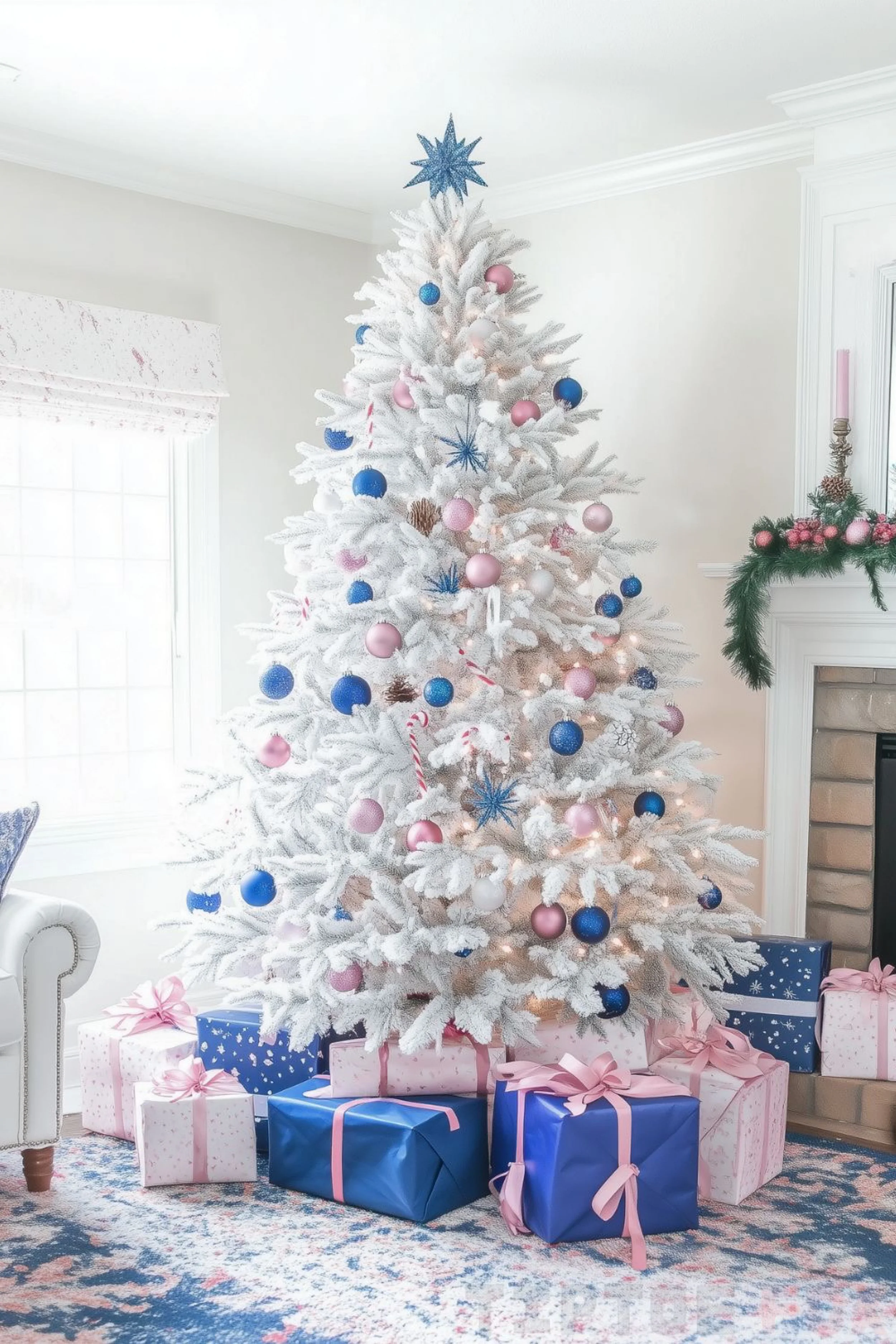 Choose a white flocked tree with a strong silhouette and full branch structure. Use warm white lights sparingly to maintain clarity of color. Select ornaments in muted blues and soft pinks and mix sizes to add depth. Place darker ornaments deeper into the branches and lighter ones outward for dimension. Keep garlands minimal or skip them entirely. Finish with neatly wrapped gifts in coordinating colors to anchor the look visually.