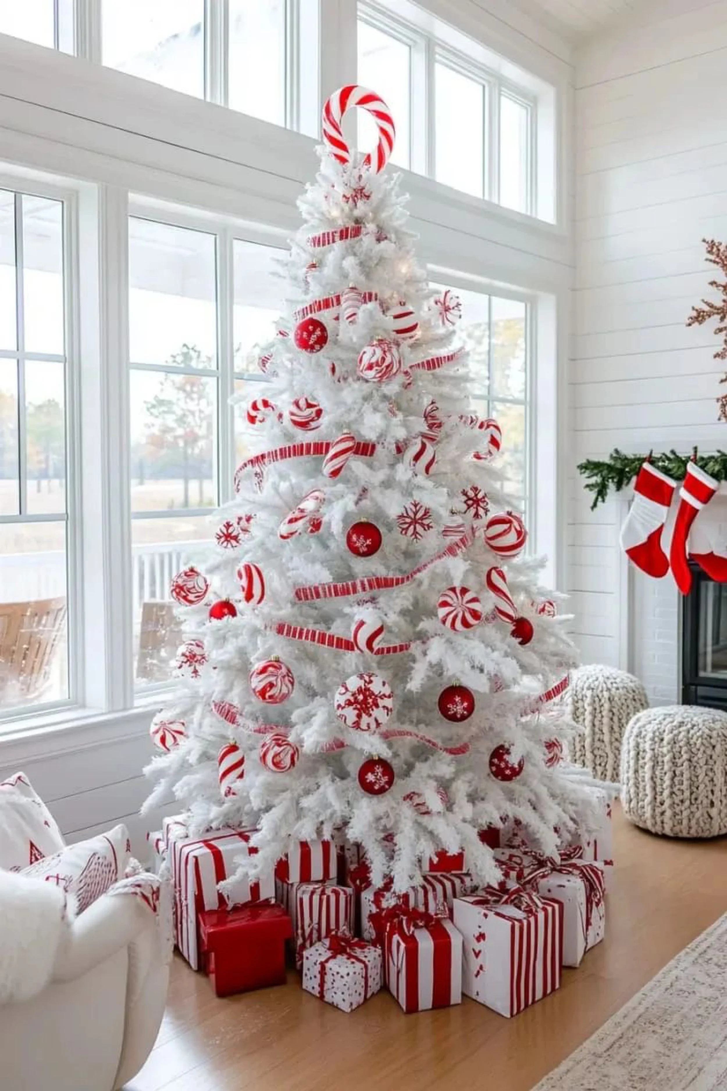 This white Christmas tree delivers a charming candy inspired look that feels cheerful, nostalgic, and full of personality. Red and white peppermint ornaments swirl across the flocked branches, complemented by striped ribbon garlands that wrap gently from top to bottom. A playful candy topper crowns the tree, reinforcing the theme without tipping into excess. Wrapped gifts below mirror the peppermint motif, creating a cohesive and joyful presentation. Set against bright windows and warm wood floors, this tree feels perfect for family rooms, cottages, or homes that lean into classic holiday cheer. The color palette is bold yet familiar, making this design instantly recognizable and comforting.