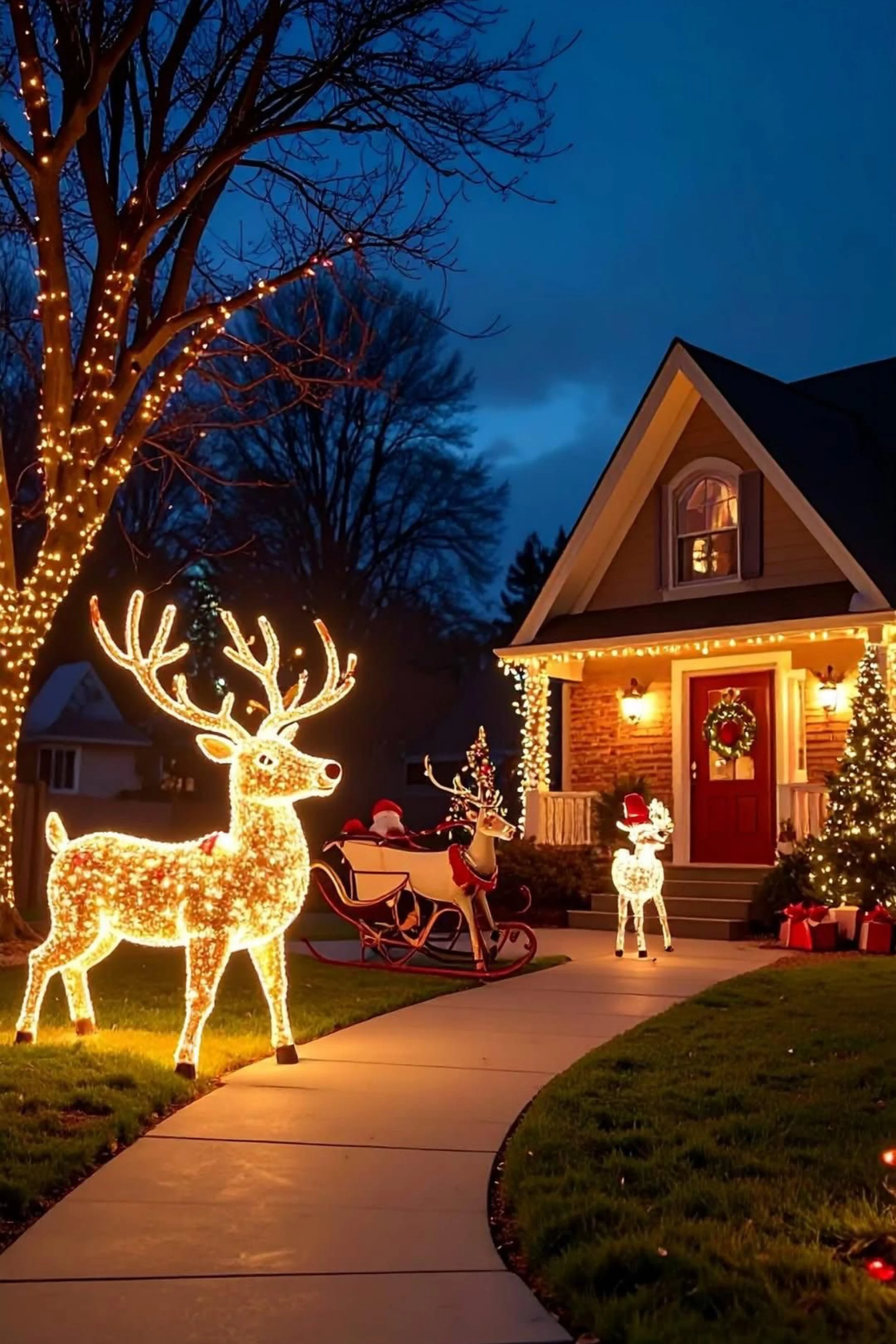 Start by choosing a central narrative piece such as a sleigh and reindeer set to anchor the entire design. Position it closer to the house rather than the curb to add depth and dimension. Stick exclusively to warm white lighting to maintain visual harmony across all elements. Use pathway lighting strategically, spacing lanterns evenly to create rhythm and flow. Frame architectural features like doors and windows with greenery before adding lights to prevent the display from feeling overly bright. Avoid mixing finishes across figures. Keeping reindeer and stars in the same metallic tone creates cohesion. Step back frequently while decorating to ensure the display reads clearly from a distance. Remove anything that distracts from the main focal point. Thoughtful restraint is what elevates this look from festive to luxurious.