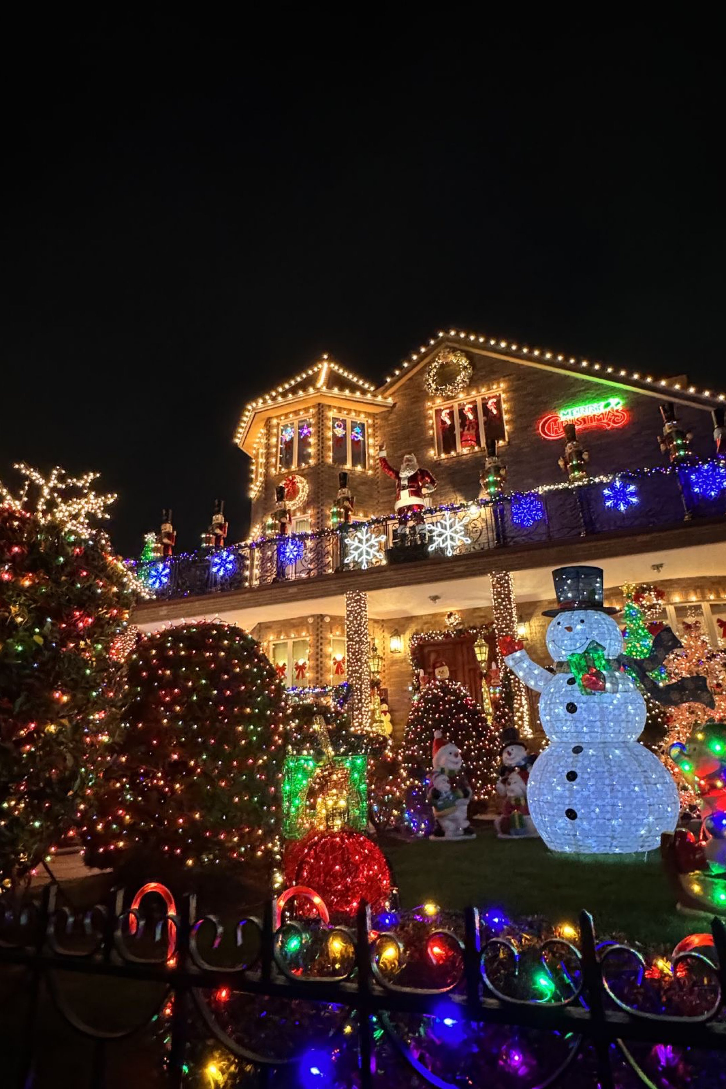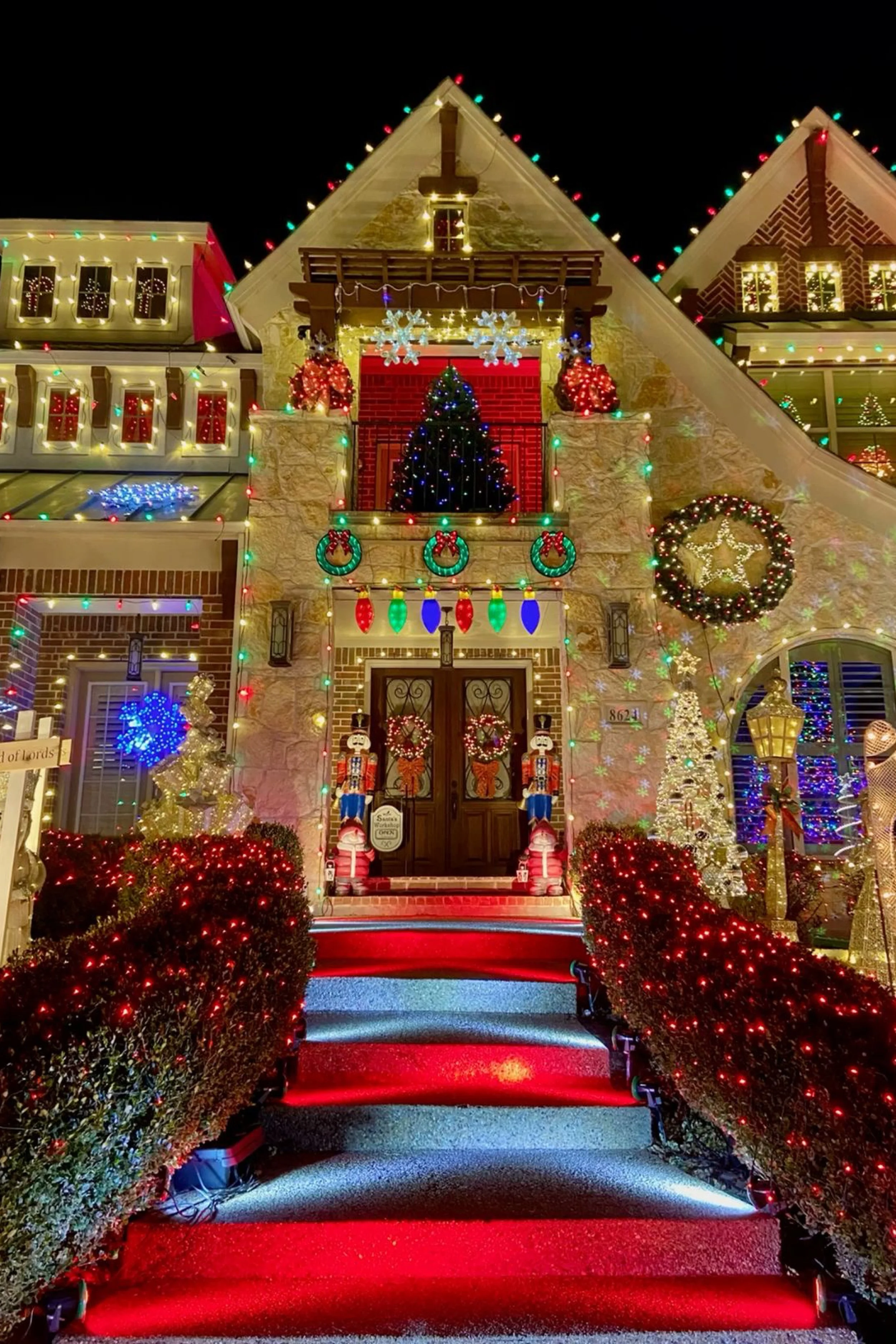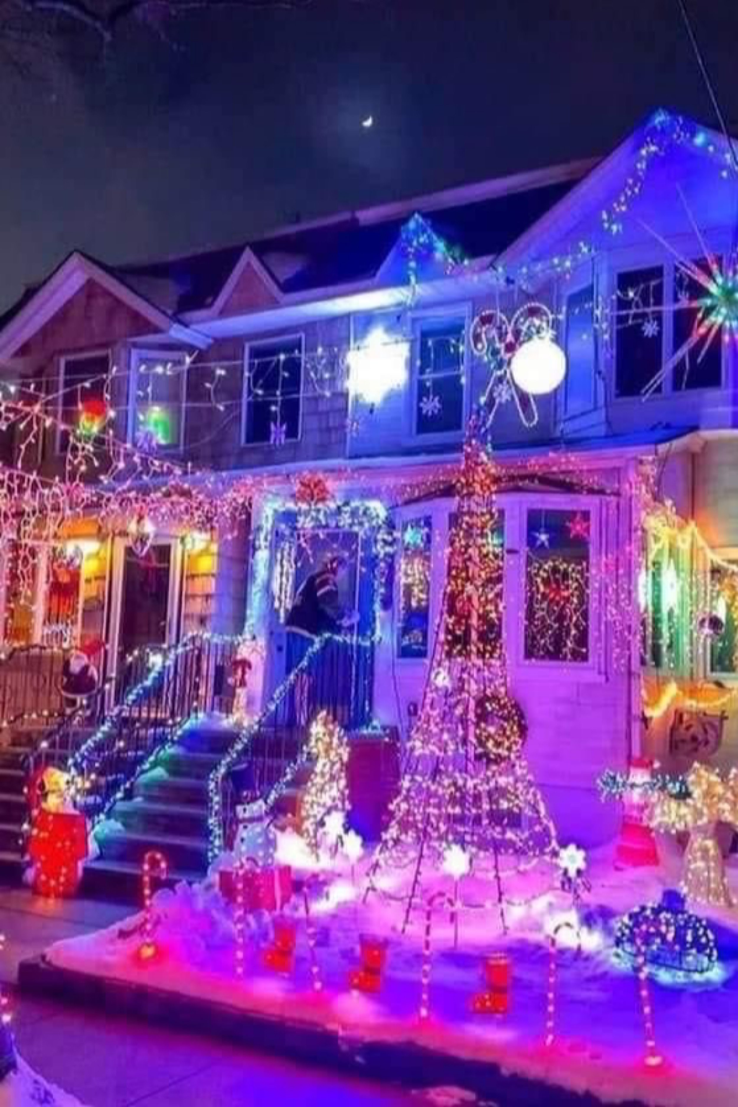 This home delivers a grand finale with layers upon layers of festive brilliance. Every shrub tree railing and window is wrapped in light, creating a glowing tapestry that feels joyful and immersive. Snowmen Santas and ornaments fill the yard, while upper balconies shimmer with coordinated motifs. The abundance feels celebratory rather than cluttered, like a holiday festival frozen into place. This is maximalism done with intention and pride.