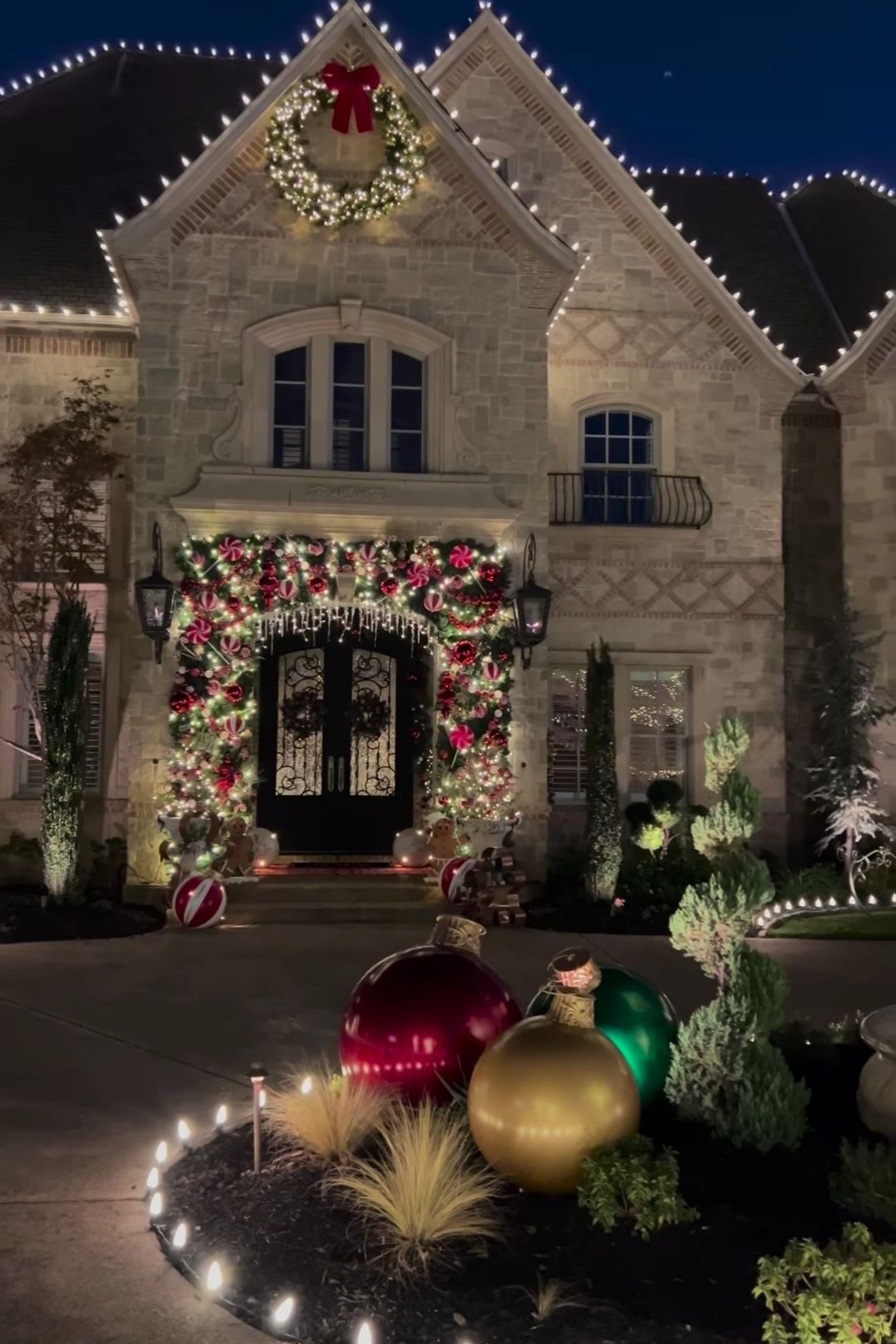 This elegant stone façade becomes a festive centerpiece through rich color and layered detail. The entryway explodes with peppermint inspired accents, blending red white and green elements into a cohesive holiday statement. Oversized ornaments anchor the landscaping, adding scale and whimsy without overwhelming the architecture. A lush garland frames the doorway, glowing with lights and candy themed ornaments that draw the eye inward. Rooflines outlined in crisp white lights keep the home grounded and refined, balancing the playful elements below. The result is bold yet polished, festive without crossing into excess. This display feels celebratory and grand, perfect for homes that want to make a confident holiday statement.