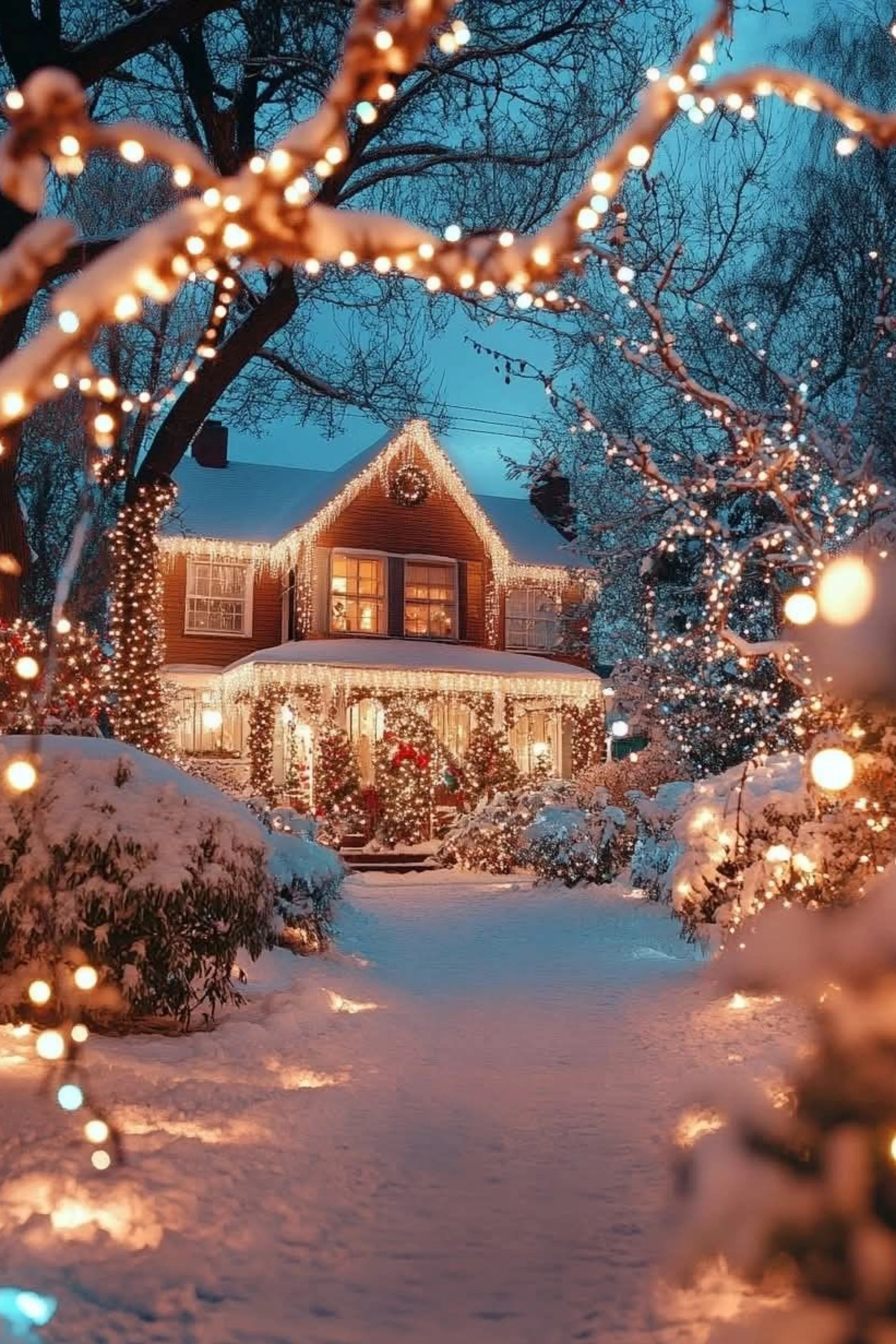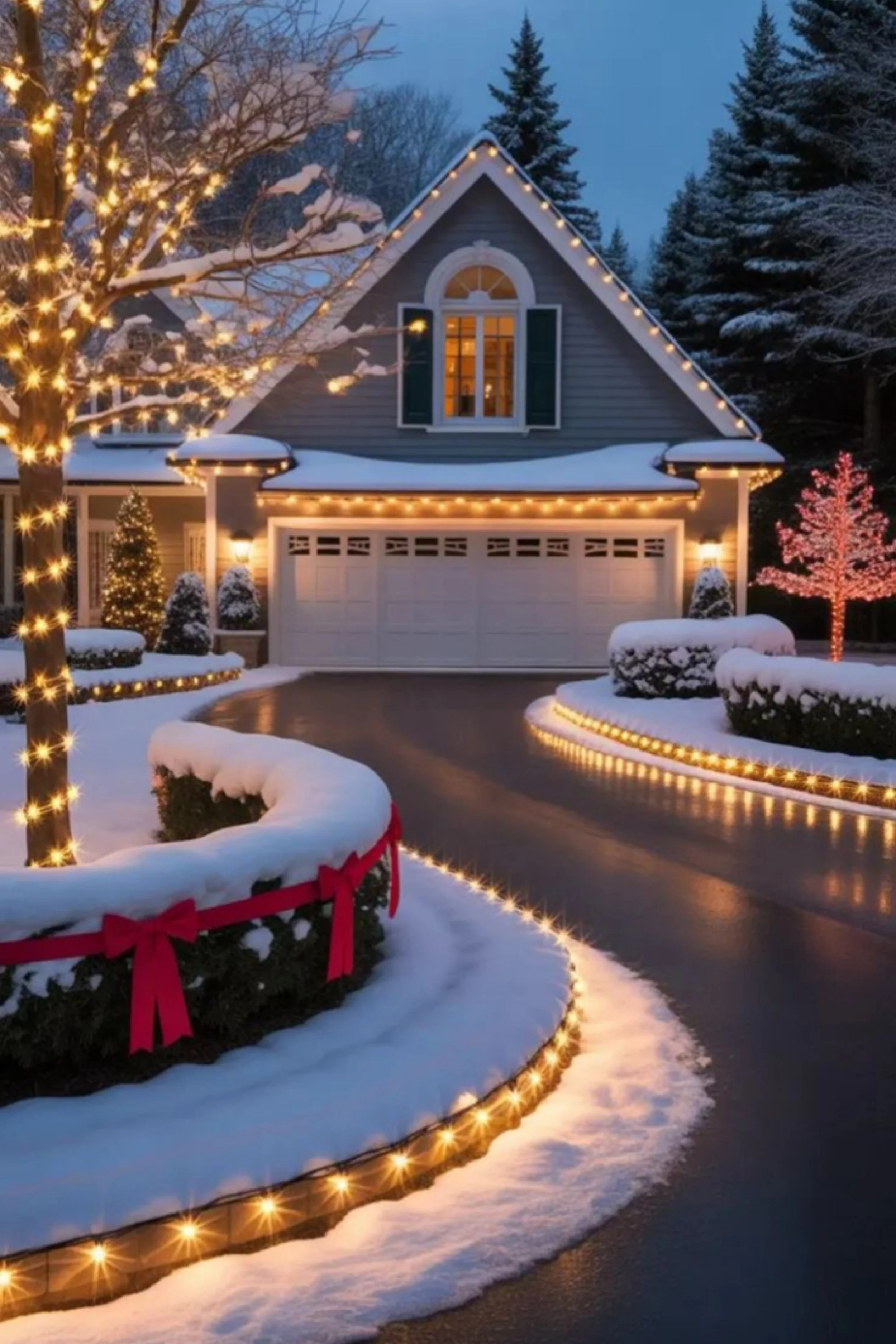 Focus on framing when working with trees and pathways. Wrap branches loosely to create a floating glow rather than dense brightness. Keep roofline lights soft and consistent. Allow snow to act as a reflective surface by avoiding overly harsh lighting. Use wreaths sparingly to anchor focal points like gables and doors. This style works best when lighting feels ambient rather than decorative.