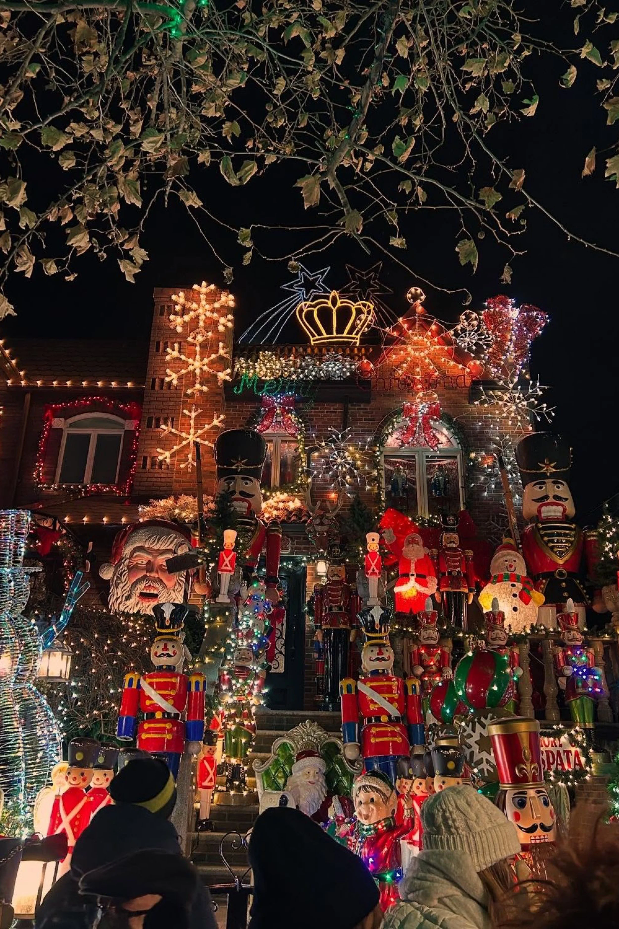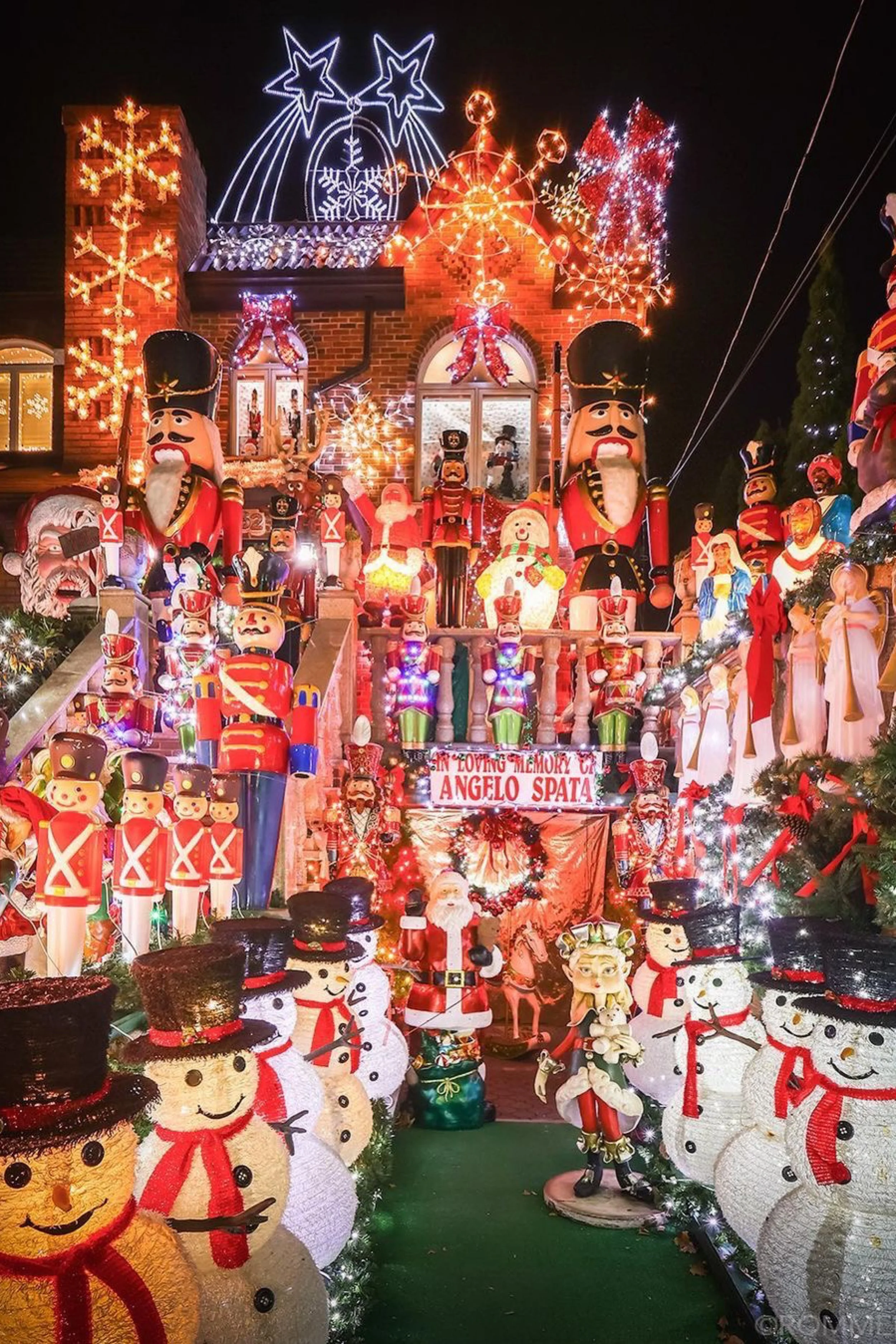 This home transforms its front yard into a joyful holiday procession filled with nostalgia and charm. Rows of nutcrackers line the walkway, creating a whimsical corridor that feels playful and immersive. Snowmen and classic figures fill every corner, each illuminated to contribute to the overall glow rather than compete for attention. The house itself becomes a backdrop, framed by festive lights and oversized motifs that echo the characters below. This display feels celebratory and heartfelt, like a tradition built year after year. It invites visitors to linger, explore, and smile.