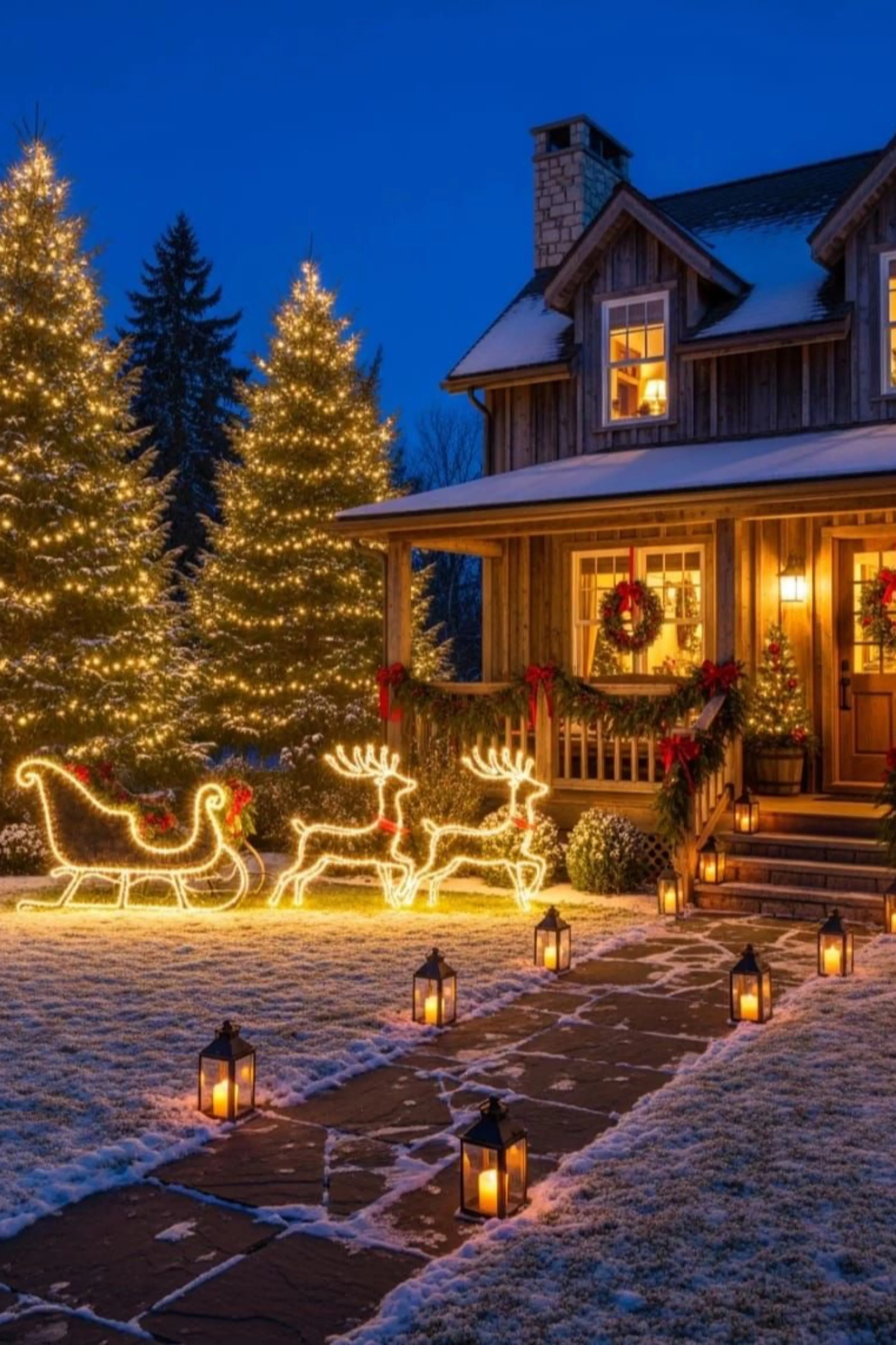 Lean into natural materials when working with rustic architecture. Use warm white lights exclusively to enhance wood tones and avoid harsh contrast. Position sleigh and reindeer figures parallel to the house rather than angled toward the street for a calmer composition. Lanterns should be spaced evenly but not perfectly symmetrical to keep the look organic. Wrap evergreen trees loosely so they glow rather than sparkle intensely. Keep porch décor minimal, allowing the interior light to play an equal role in the display. This look succeeds when everything feels softly illuminated rather than brightly lit.