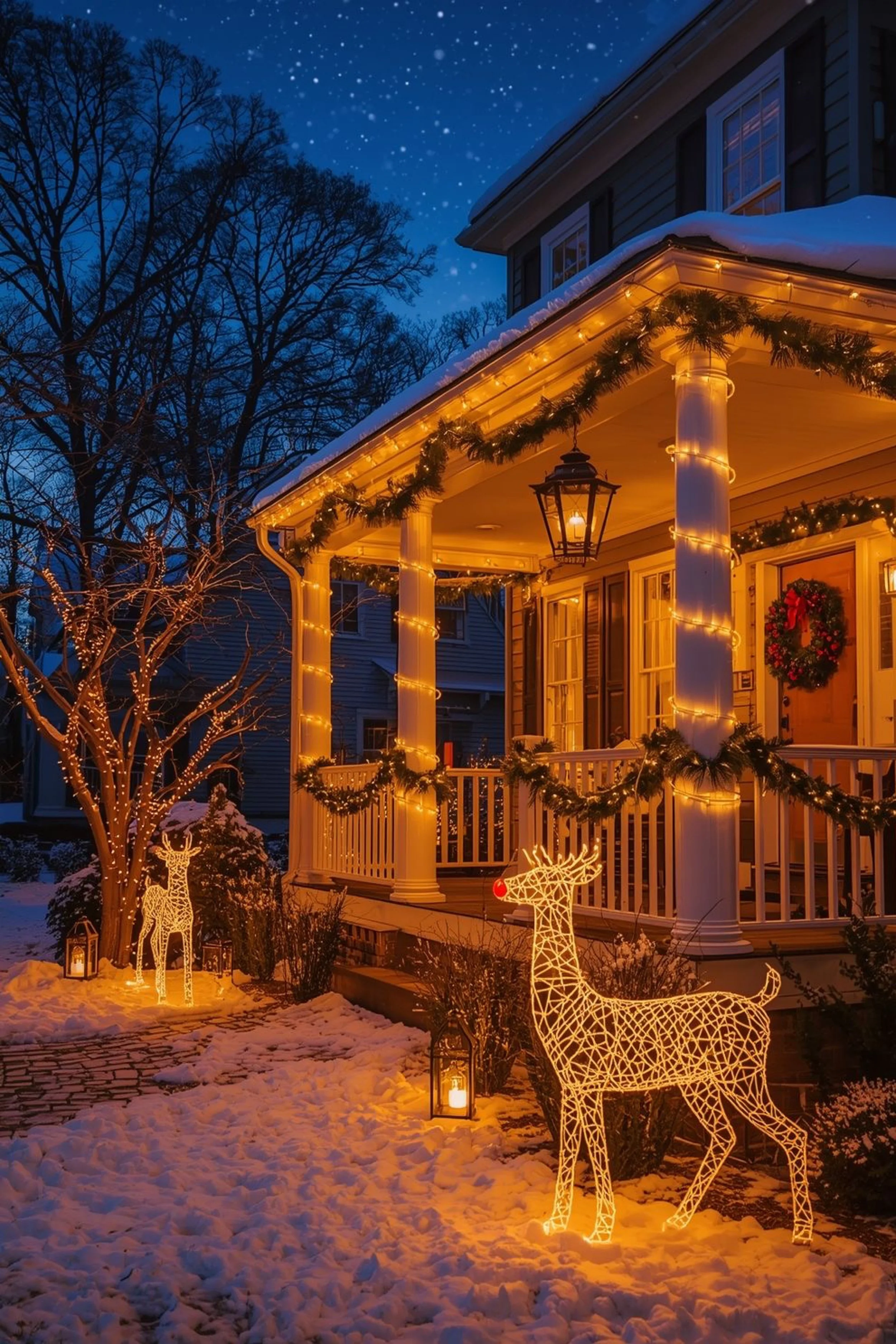 This display leans into refined holiday elegance, using light and symmetry to create a serene winter atmosphere. Slender wire reindeer glow softly against the snow, positioned to frame the porch without overwhelming it. Columns wrapped in warm lights draw attention upward, emphasizing the architecture and creating a sense of grandeur. Lanterns placed near the steps add intimacy and warmth, contrasting beautifully with the cool blue of the winter evening sky. Garlands draped along the porch railings soften the structure and introduce natural texture. The entire scene feels calm and intentional, as if designed for quiet evening admiration rather than spectacle. This is a display that invites you to slow down, breathe, and enjoy the season.