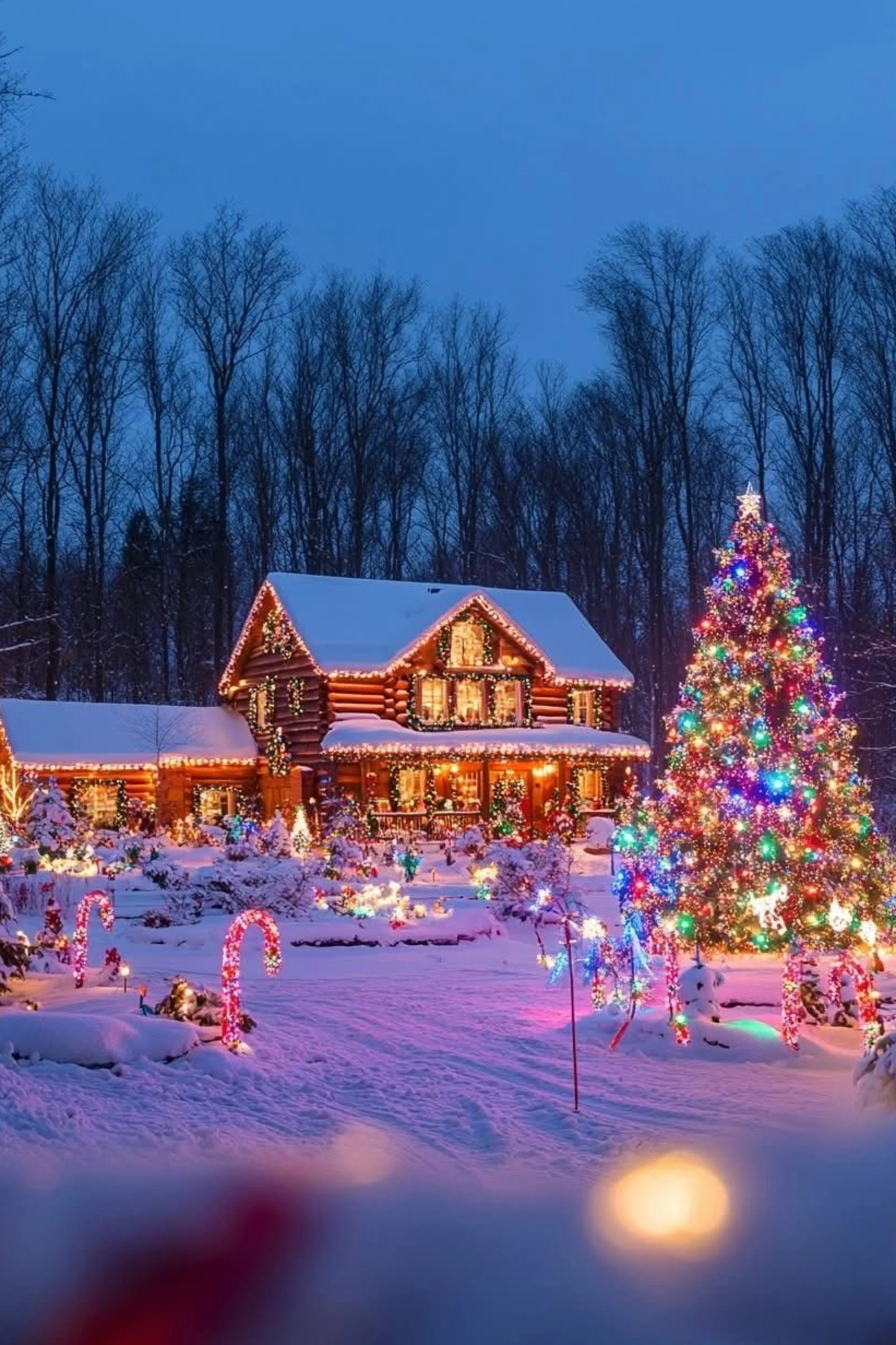 Set against a wooded backdrop, this home feels like a private holiday retreat. A towering outdoor Christmas tree bursts with multicolored lights, becoming the undeniable centerpiece of the scene. Candy cane pathway lights guide visitors through the snow, adding whimsy and nostalgia. The cabin style home glows warmly beneath soft white roofline lights, creating contrast against the darker forest beyond. Smaller yard accents sparkle subtly, ensuring the tree remains the star. This display feels joyful and immersive, blending playful elements with natural surroundings. It captures the magic of Christmas in the woods, where light becomes a beacon against the quiet night.
