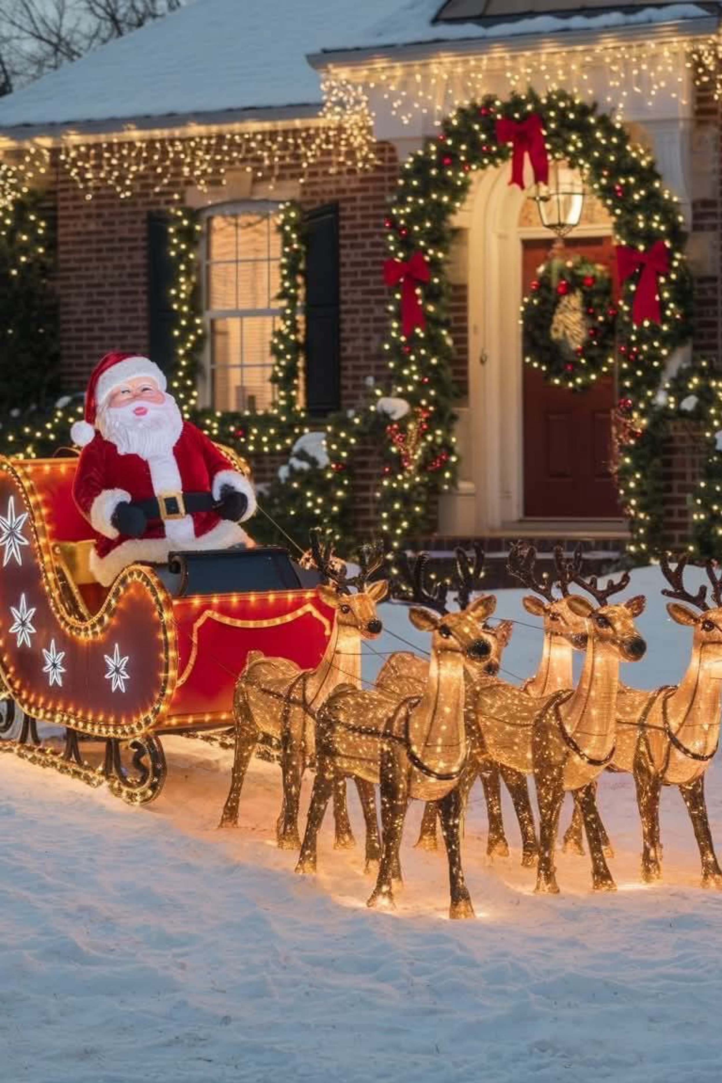 Position sleigh and reindeer sets parallel to the home for a grounded appearance. Keep surrounding décor minimal so the figures remain the focal point. Use warm white lighting to soften metallic finishes. Frame the display with greenery and architectural lighting rather than adding extra lawn figures. This look works best when it feels like a single cohesive moment.