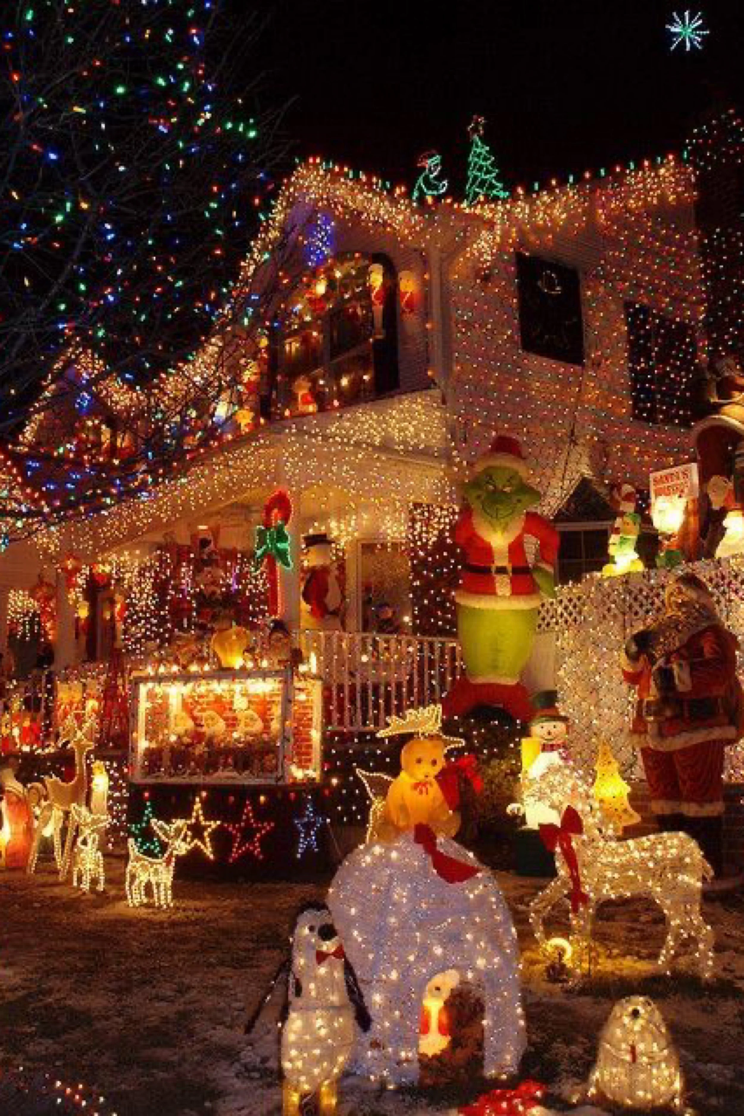 This display leans fully into playful excess, covering the home in a joyful explosion of color and character. Every surface sparkles with multicolored lights, inflatable figures, and glowing accents that transform the property into a festive wonderland. Santa snowmen reindeer and holiday icons fill the yard, creating a layered scene that feels energetic and alive. Rooflines trees and railings all contribute to the spectacle, making the house impossible to miss. This is a display designed to delight children and adults alike, celebrating Christmas through abundance and joy.